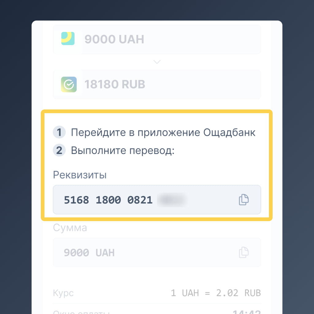 Вы увидите номер нашей карты украинского банка, на которую нужно сделать перевод.
