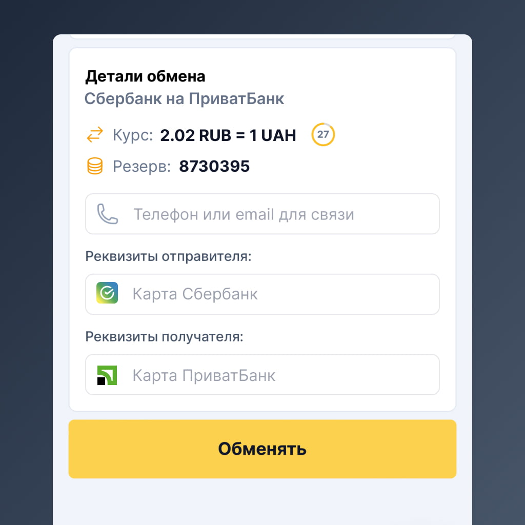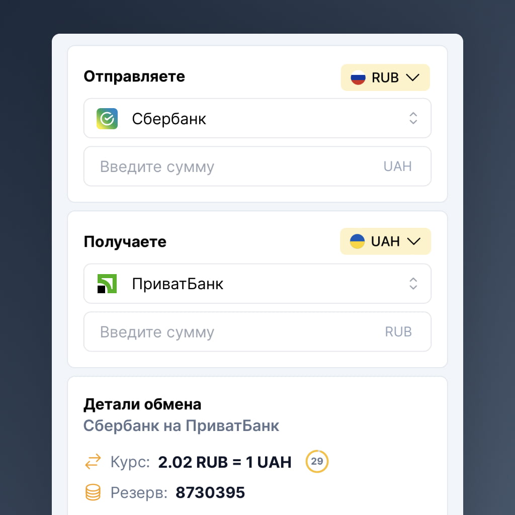 Неважно, в Киеве вы или в Донецке, в Кропивницком или Торезе, в России или Европе. Наш сервис помогает обменивать и переводить деньги легко и без границ.