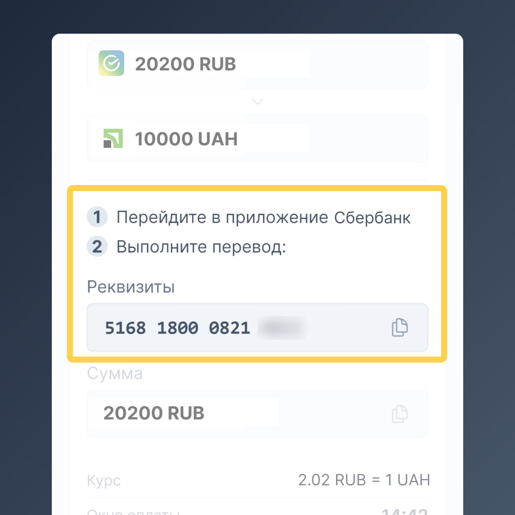 Вы увидите номер нашей карты украинского банка, на которую нужно сделать перевод.